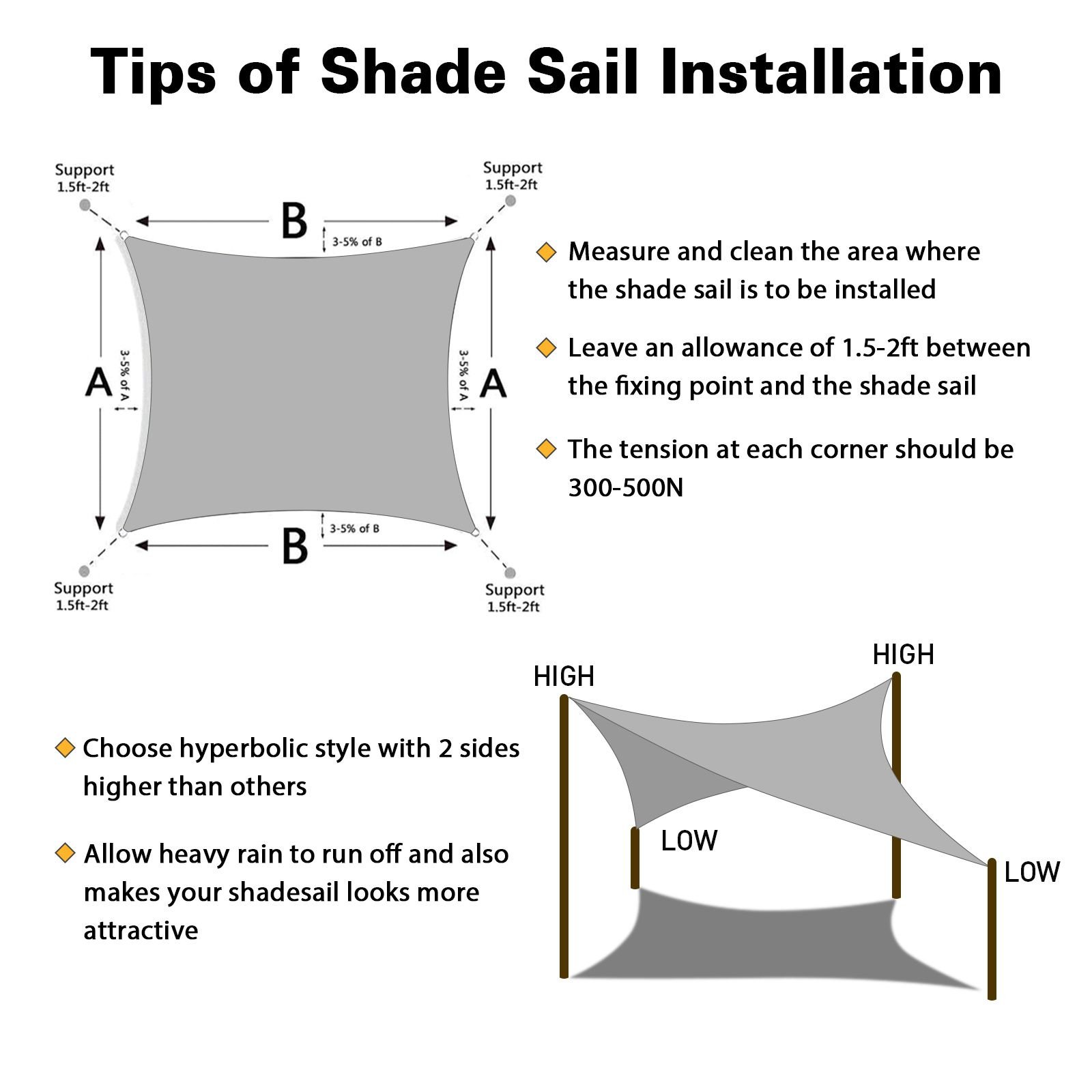 1.Easy to Custom Size: We make custome size sun shade sail with 185 gsm UV protected high density polyethylene (100%HDPE) shade fabric with strong stitched seam. With Durable Stainless Steel D-rings in each corner make the sun sails easily attached to any sturdy connection point to provide sun protection and personal design where you need it.