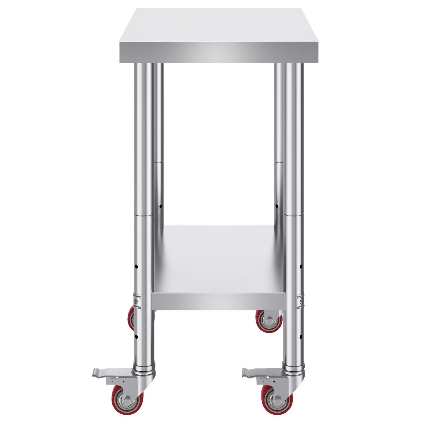 - Superior commercial work table. Constructed by durable stainless steel, corrosion, and wear-resistant; It won't deform easily. 24 x 18 x 2.2 in upper table size and 18.9 x 13 x 1.8 in undershelf provide ample storage space. 4 chaster wheels provide flexibility. You can easily change the height of the undershelf—perfect using in the kitchen, restaurant, school, or other domestic or commercial applications.