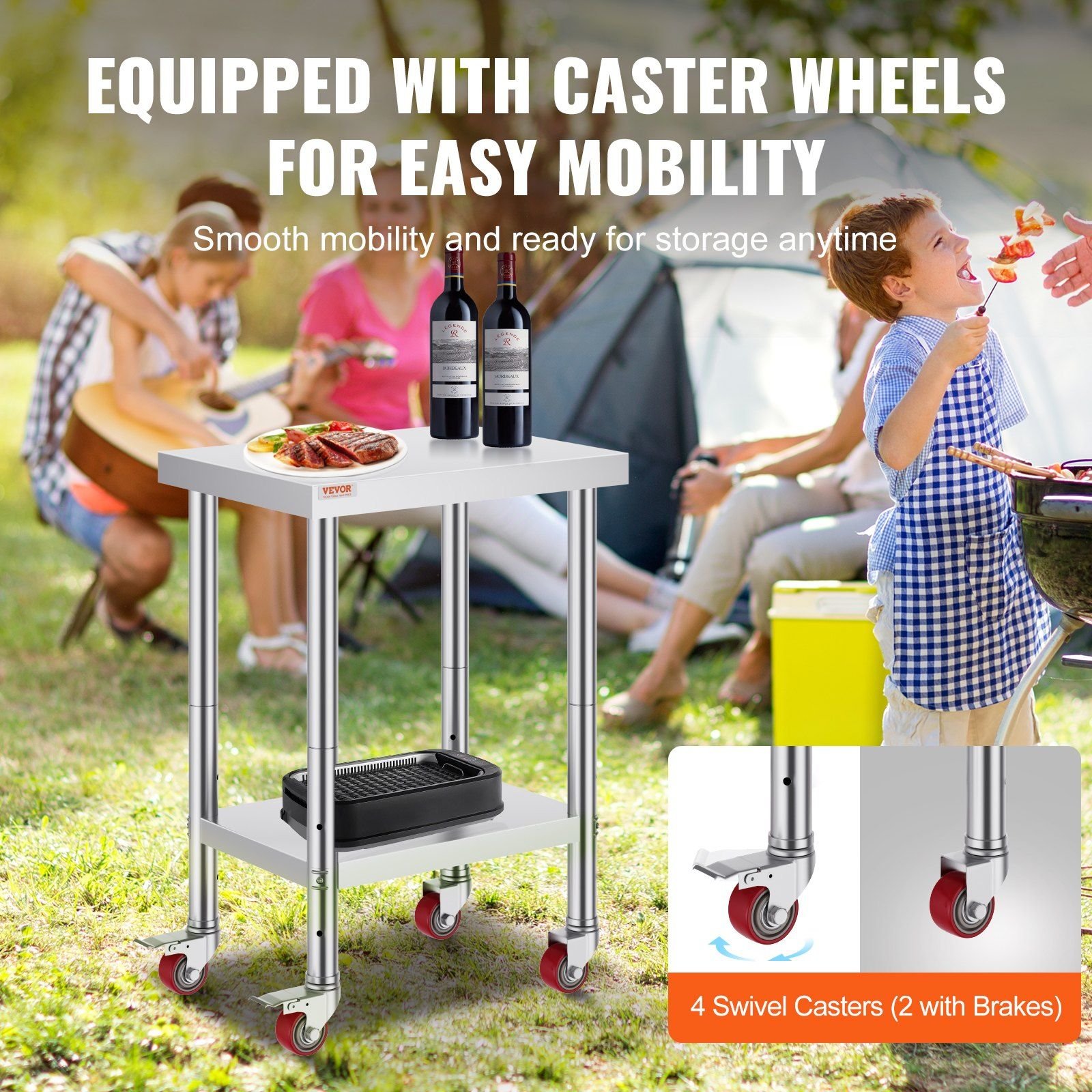Superior commercial work table. Constructed by durable stainless steel, corrosion, and wear-resistant; It won't deform easily. 24 x 18 x 2.2 in upper table size and 18.9 x 13 x 1.8 in undershelf provide ample storage space. 4 chaster wheels provide flexibility. You can easily change the height of the undershelf—perfect using in the kitchen, restaurant, school, or other domestic or commercial applications.